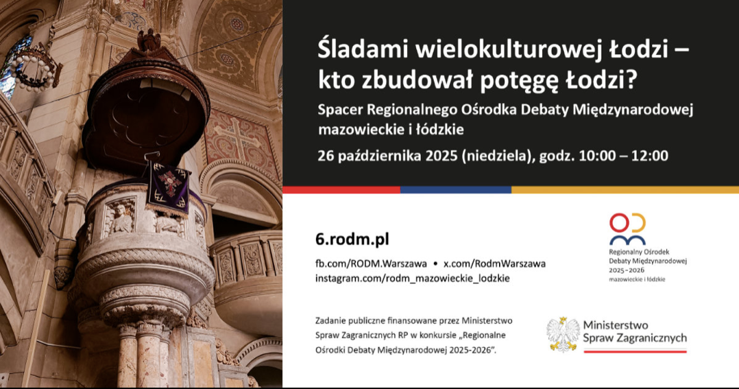 Zapraszamy na spacer po wielokulturowej Łodzi, który organizujemy wraz z Regionalnym Ośrodkiem Debaty Międzynarodowej 2025-2026 (mazowieckie i łódzkie).