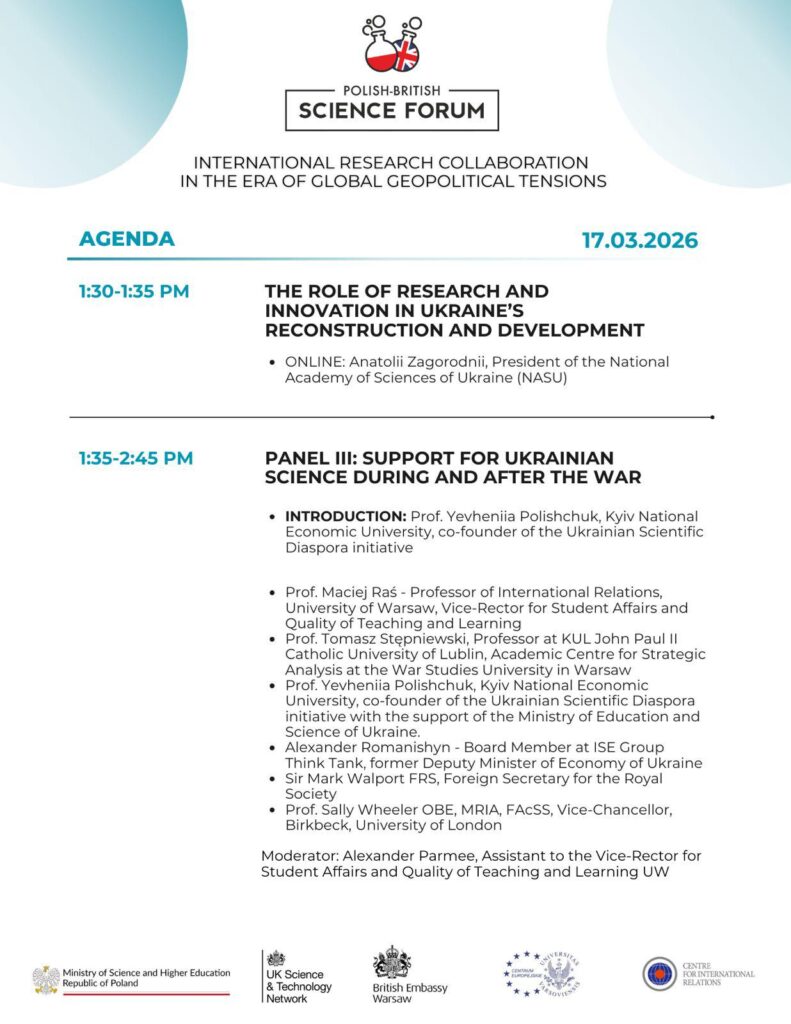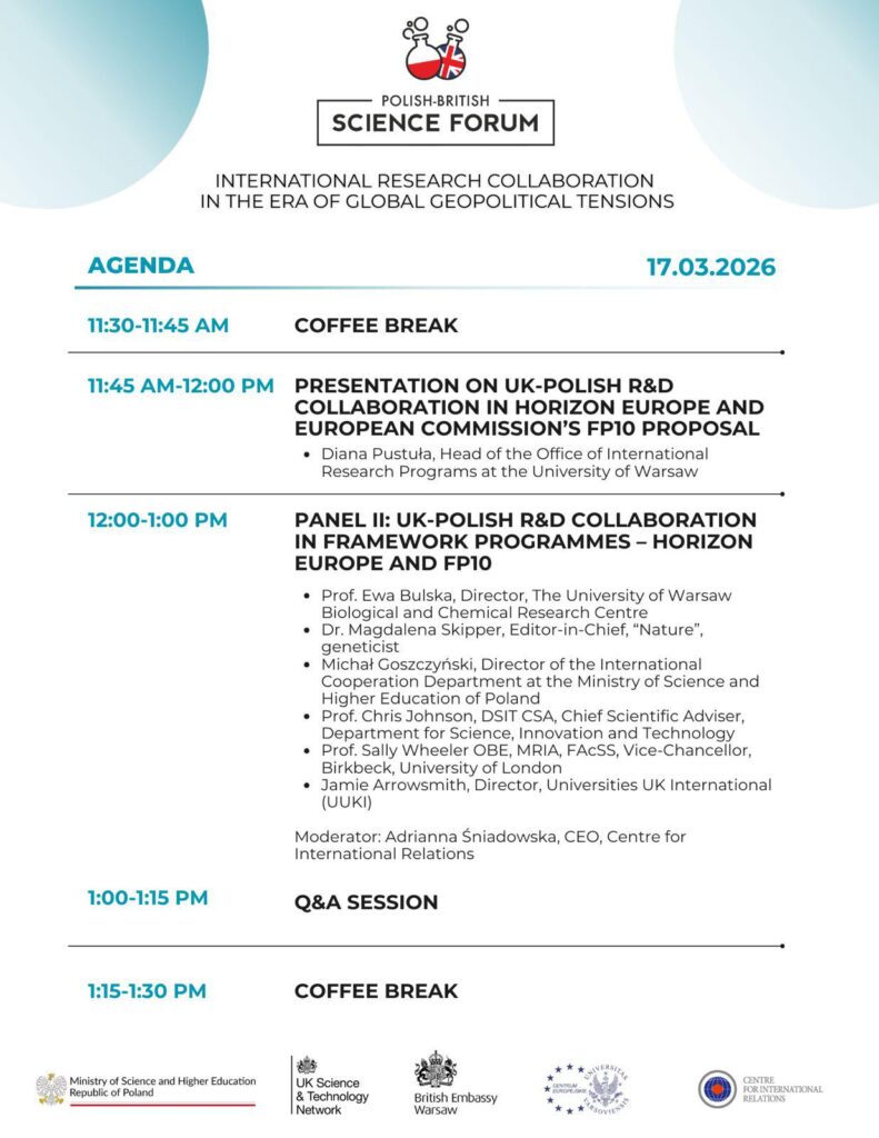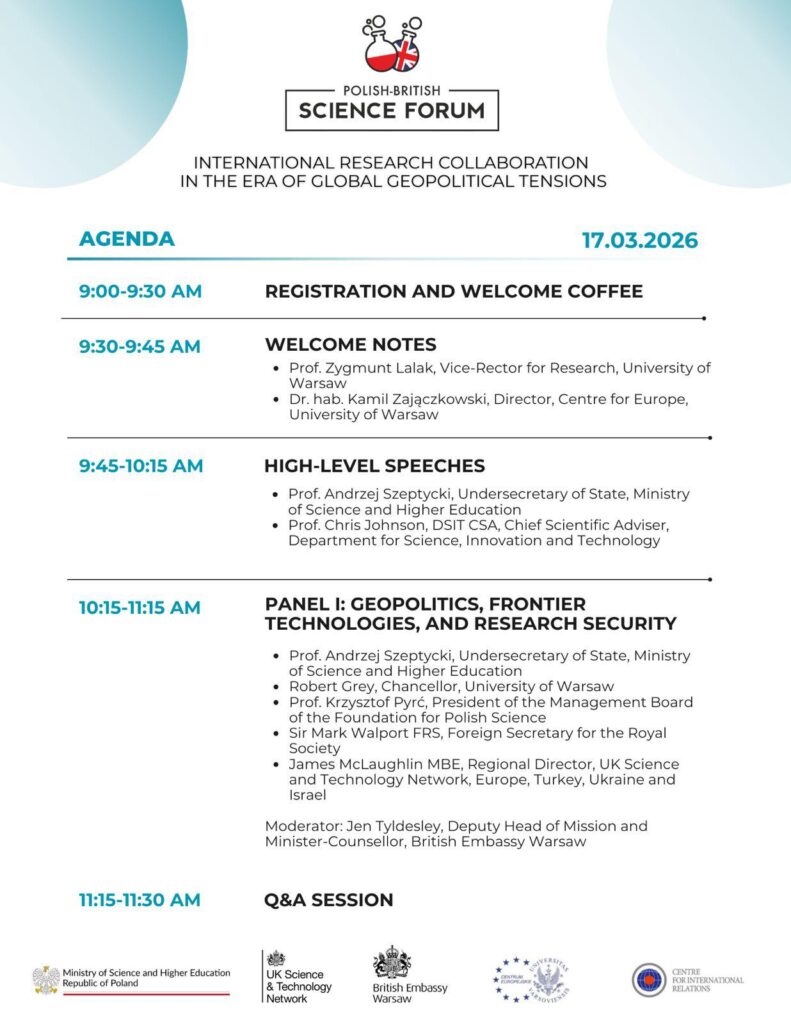 Z przyjemnością zapraszamy do udziału w Polsko-Brytyjskim Forum Naukowym, które odbędzie się 17 marca 2026 r. w godzinach 9:00-15:15 w Sali Kolumnowej (Wydział Historii) na Głównym Kampusie Uniwersytetu Warszawskiego (Krakowskie Przedmieście 26/28, Wydział Historii, Sala Kolumnowa).